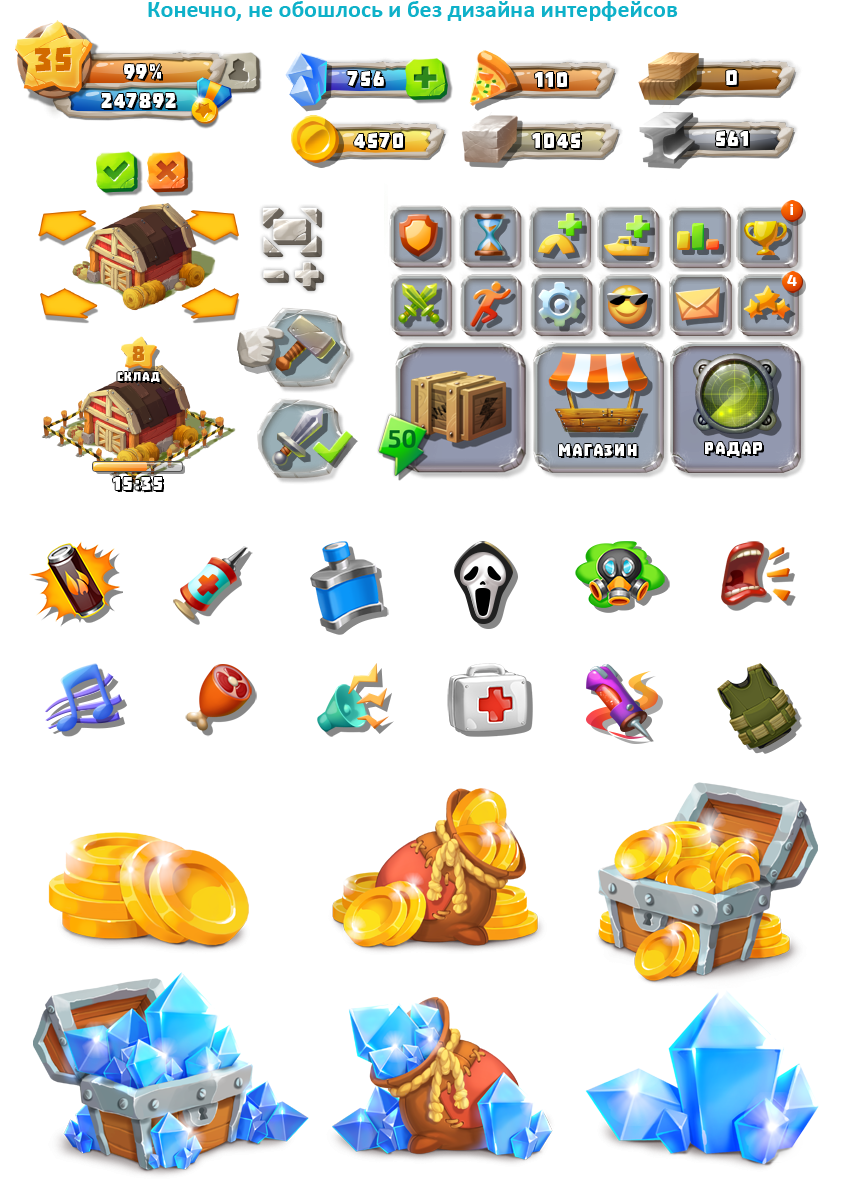 Самый казуальный пост-апокалипсис, который нам приходилось рисовать (да и вообще видеть). Геймплей игры разделен на две составляющих: стратегическая (строительство и обустройство базы на острове) и файтинговая (можно грабить корованы соседей или захватывать ресурсоносные острова. Боевка построена по принципу "героев меча и магии": формируем отряд, разучиваем дополнительные скилы и встречаемся "стенка на стенку" на боевой позиции в пошаговом сражении.